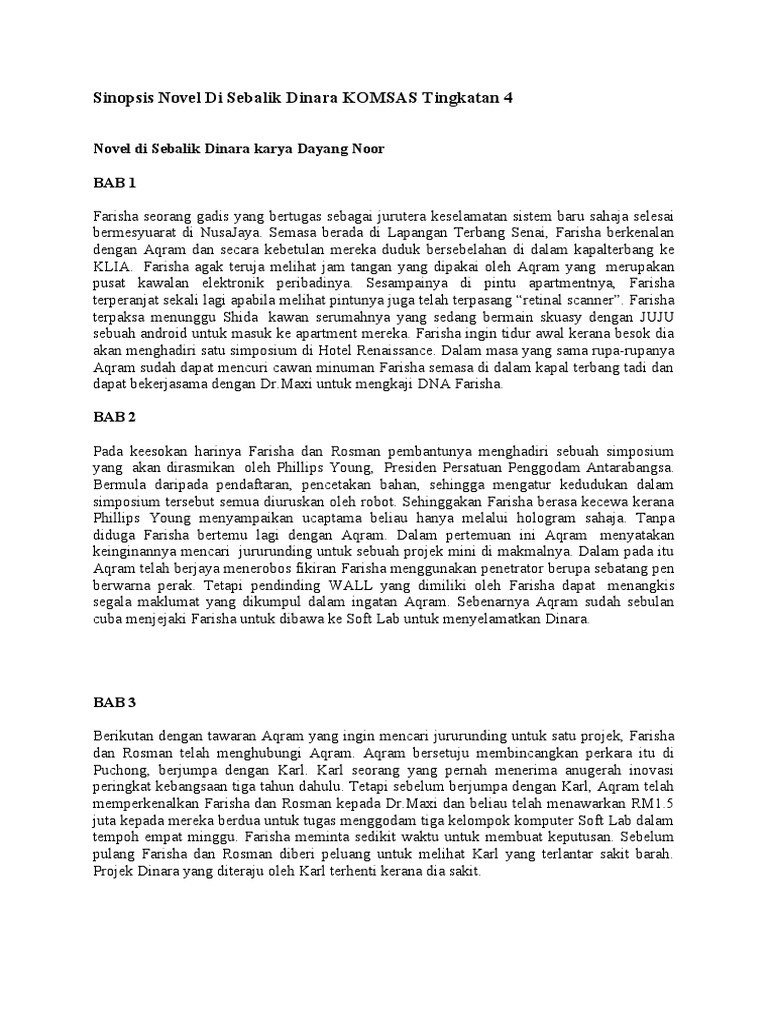 Novel Komsas Tingkatan 4 2015-Download Save. Novel Komsas Tingkatan 4 Sinopsis yang dikongsikan ini mengikut bab dalam novel Di Sebalik Dinara sebagai rujukan kajian Komsas Tingkatan 4 tahun 2015-2020. Semoga perkongsian nota-nota rujukan bahasa melayu contoh-contoh karangan bahan-bahan pembelajaran dan pengajaran SPM Sijil Pelajaran Malaysia tingkatan 4 tingkatan 5 dalam post di blog Bumi Gemilang berguna dan dapat membantu para pelajar dan pengguna.
